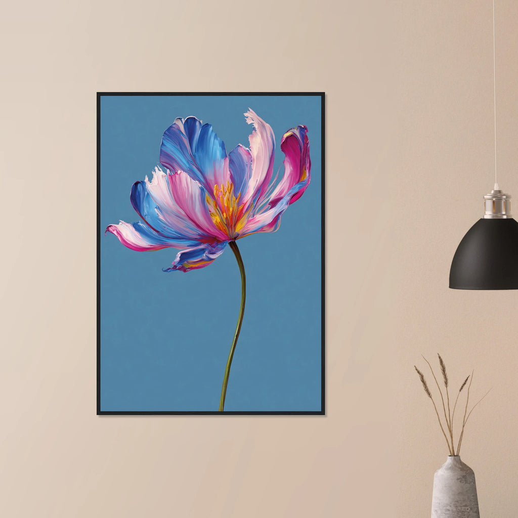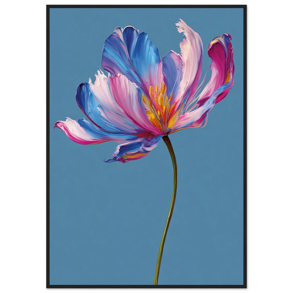 En livfull blomma målad i oljefärgsliknande penseldrag där varje kronblad vibrerar i rosa, blått och lila mot en klarblå bakgrund. Ett stiliserat och färgstarkt motiv som hyllar naturens former med konstnärlig frihet.